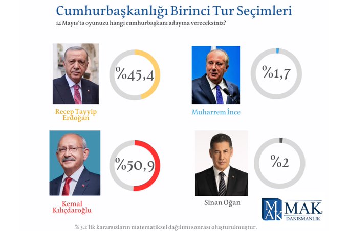 MAK Araştırma Şirketi birinci tur cumhurbaşkanlığı seçimi araştırması sonucunu yayınladı. MAK yaptığı son ankete göre birinci turda Millet İttifakı’nın cumhurbaşkanı adayı Kemal Kılıçdaroğlu yüzde 50,9 ile birinci sırada tamamlarken Cumhurbaşkanı ve AKP Genel Başkanı Erdoğan’ın oy oranı yüzde 45,4 olarak açıkladı. Muharrem İnce yüzde 1,7 oy oranına sahipken Sinan Oğan yüzde 2 oy oranı aldığı görüldü…