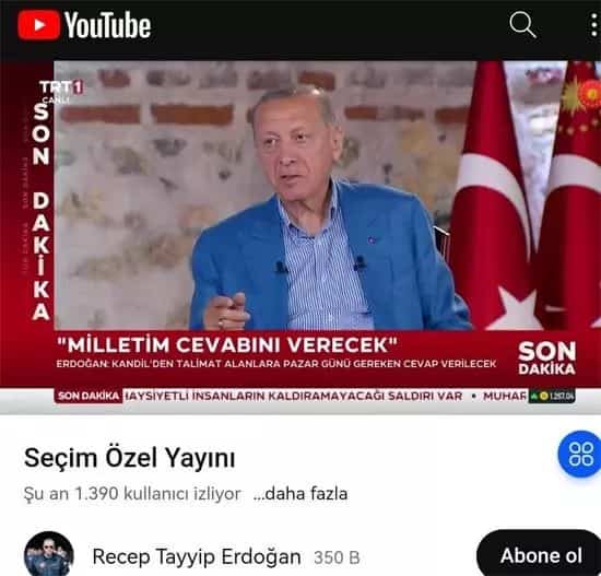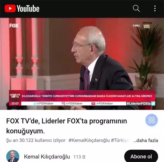 Cumhurbaşkanı adaylarının youtube yayınlarında açıkça görülen izleyici sayıları aradaki farkı gözler önüne serdi. Cumhurbaşkanı adayı ve CHP Lideri Kemal Kılıçdaroğlu TV’de çıktığı canlı yayını YouTube hesabından da paylaştı. Kılıçdaroğlu’unun izleyici sayısı 30 bini aştı…