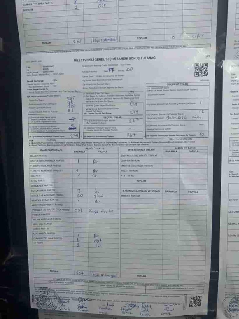 Söz konusu iddiaya göre Yeşiller Sol Parti’nin 233 oyu MHP’ye yazıldı. İlgili sandığın ıslak imzalı tutanağı ve sandık sonucu şöyle: