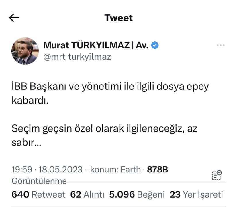 İBB Başkanı İmamoğlu hakkında “Dosya kabardı…Seçim geçsin özel olarak ilgileneceğiz.” diyen Murat Türkyılmaz, aynı zamanda İBB yönetimini de tehdit etti. Türkyılmaz’ın paylaşımına tepki yağarken, Türkyılmaz’ın paylaşımını silmediği görüldü…