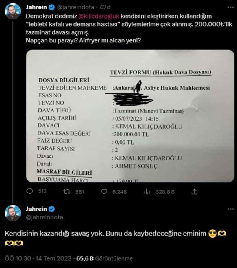 Kılıçdaroğlu, kendisi için sarf ettiği sözler nedeniyle Sonuç’a 200 bin TL’lik tazminat davası açtı.