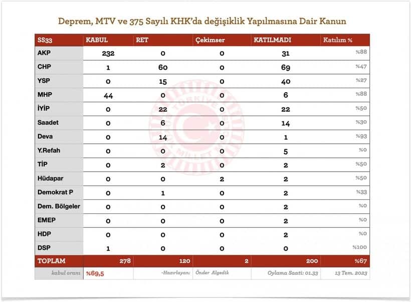 Seçimlerde halkın yüzde 88’den fazlasının sandığa gittiğini hatırlatan Algedik, söz konusu düzenlemenin görüşmelerine katılmayan vekillerin oranını da paylaştı…