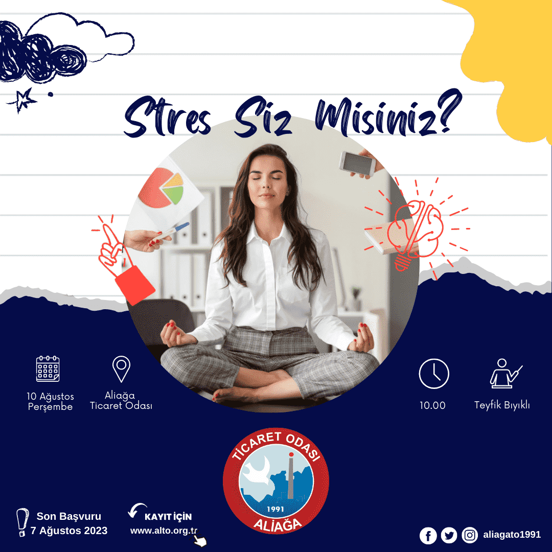 2023 yılı için planlanan eğitimi takvimi kapsamında 10 Ağustos 2023 (Perşembe) günü saat 10.00’ da, Aliağa Ticaret Odası Eğitim Salonunda ‘Stres Siz Misiniz?’ eğitimi düzenlenecek.