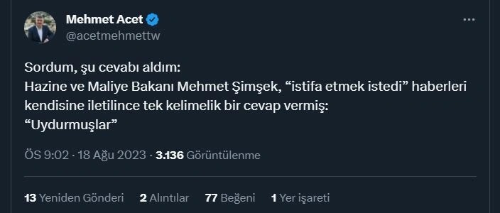 Haber7 Yazarı Mehmet Acet, Hazine ve Maliye Bakanı Mehmet Şimşek’in istifa iddialarına ilişkin ilk tepkisini sosyal medya hesabından paylaştı.