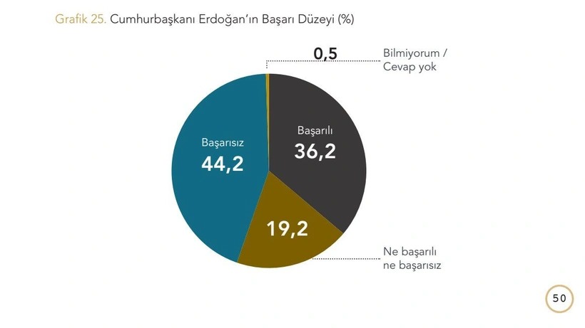 Araştırmaya katılan seçmenlerin yüzde 44,2’si Erdoğan’ı başarısız bulduğunu söyledi. Araştırmaya katılan seçmenlerin yüzde 36,2’si Erdoğan’ı başarılı bulduğunu ifade etti.
