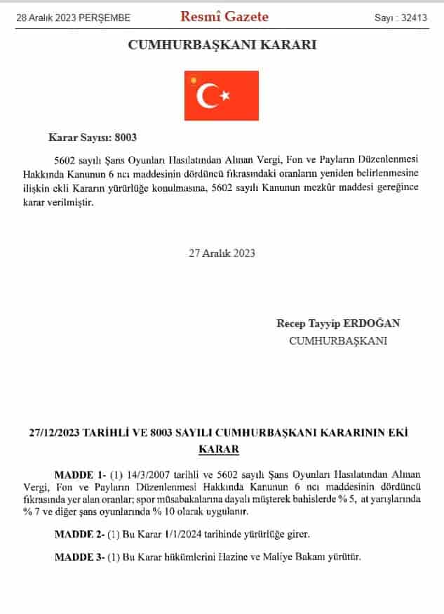 Resmi Gazete’nin bugünkü sayısında yayımlanan konuya ilişkin Cumhurbaşkanı kararına göre, söz konusu vergi oranları; spor müsabakalarına dayalı müşterek bahislerde yüzde 10’dan yüzde 5’e, at yarışlarında yüzde 14’ten yüzde 7’ye, diğer şans oyunlarında yüzde 20’den yüzde 10’a indirildi.