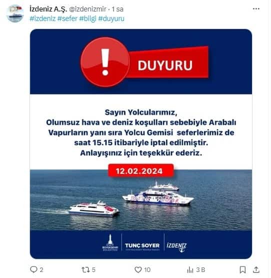 İZDENİZ Genel Müdürlüğünün açıklamasına göre, yolcu ve arabalı vapur seferleri geçici süreliğine durduruldu.