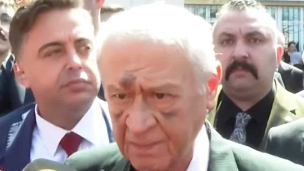 Bahçeli sol kolunda sargı, iki güzünün altında ve alnında morluklar ile görüldü.