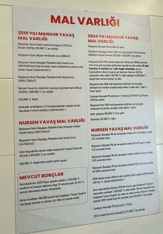 İlanda, “2019 yılı Mansur Yavaş mal varlığı ile 2024 yılı Mansur Yavaş mal varlığı” ile “Nursen Yavaş malvarlığı” başlıkları altında varlık kalemlerine yer verildi.
