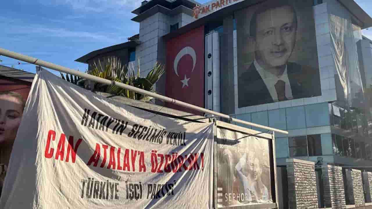 Serbest bırakılmayan Atalay için TİP İzmir örgütü, AKP’nin Bayraklı’da bulunan il binasının önüne “Hatay’ın seçilmiş vekili Can Atalay’a özgürlük!” yazan pankart astı…