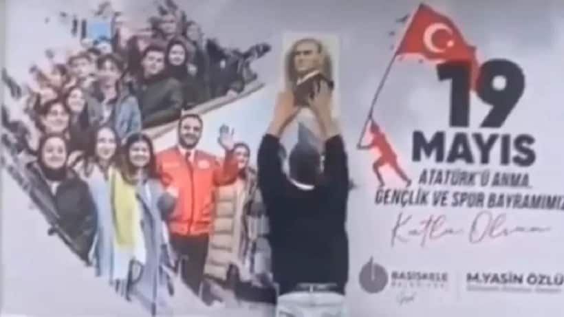Sosyal medyanın gündemine yerleşen görüntülerde vatandaşın elinde sandalye ve Atatürk posteriyle söz konusu afişe yanaştığı görüldü. Sandalyeye çıkıp afişin boş bir alanına elindeki Atatürk posterini yapıştıran vatandaş daha sonra sandalyeden inip afişi tekrar gözden geçirdi.