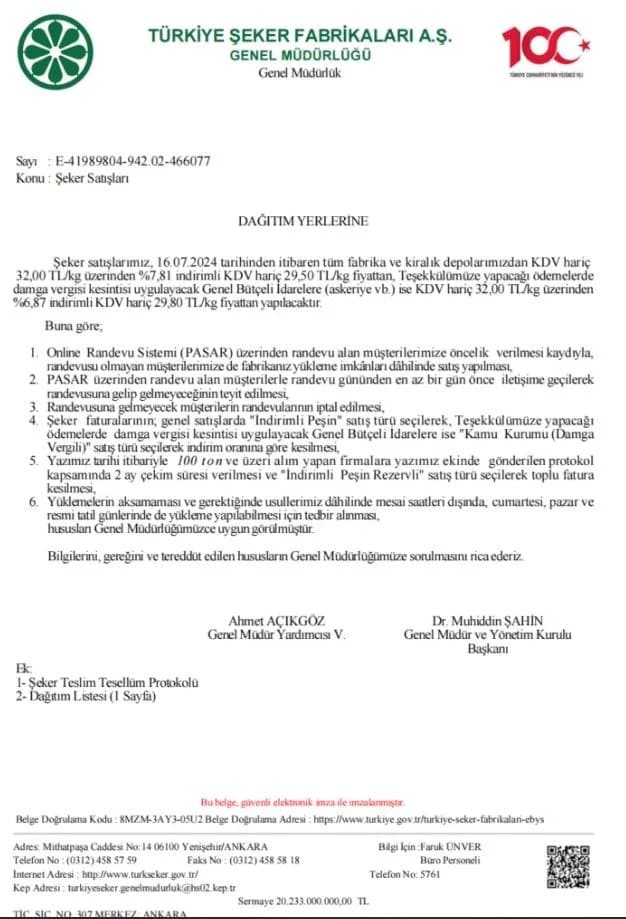 Şeker satışlarımız, 16.07.2024 tarihinden itibaren tüm fabrika ve kiralık depolarımızdan KDV hariç 32,00 TL/kg üzerinden %7,81 indirimli KDV hariç 29,50 TL/kg fiyattan, Teşekkülümüze yapacağı ödemelerde damga vergisi kesintisi uygulayacak Genel Bütçeli İdarelere (askeriye vb.) ise KDV hariç 32,00 TL/kg üzerinden %6,87 indirimli KDV hariç 29,80 TL/kg fiyattan yapılacaktır