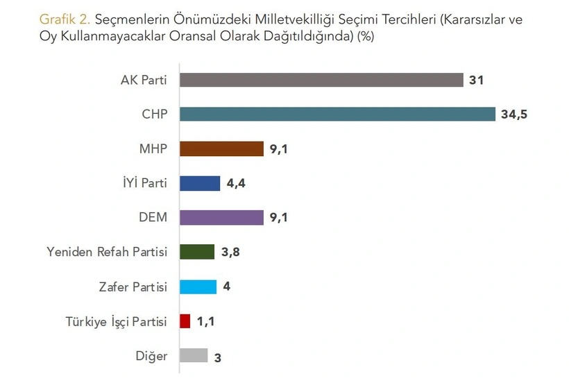 MHP’nin ve DEM Parti’nin oy oranı yüzde 9,1 olurken, İYİ Parti’nin oy oranı ise yüzde 4,4 olarak kaydedildi. Zafer Partisi yüzde 4, Yeniden Refah Partisi yüzde 3,8, TİP ise yüzde 1,1 oy oranına sahip…
