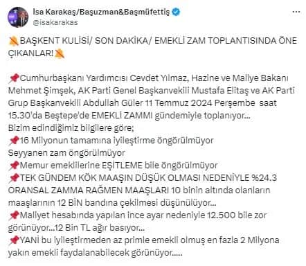 Yarın Cumhurbaşkanı Yardımcısı Cevdet Yılmaz, Hazine ve Maliye Bakanı Mehmet Şimşek, AKP Genel Başkanvekili Mustafa Elitaş ve AKP Grup Başkanvekili Abdullah Güler saat 15.30’da Beştepe’de emekli zamlarını görüşmek üzere toplanacak.