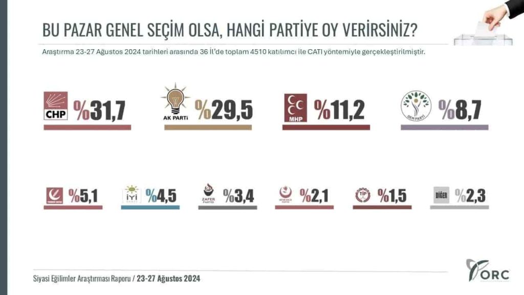 KUZEYEGEHABER-ORC Araştırma, Ağustos 2024’te yaptığı Siyasi Eğilimler Araştırması ile “Bu pazar genel seçim olsa” anketinin sonuçlarını açıkladı.