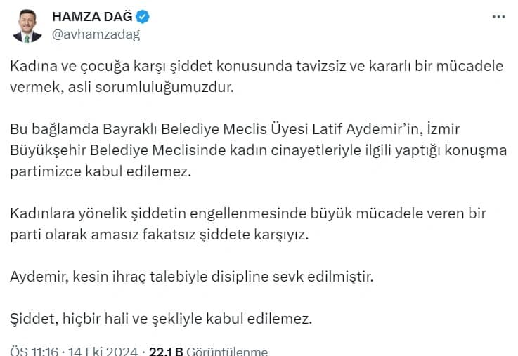 KUZEYEGEHABER-İzmir’de AKP Bayraklı Meclis Üyesi Latif Aydemir, “Hanımlarımızı kadınlarımızı tenzih ediyorum ama bir kısmı bayanlar olmak üzere erkeklerin de çoğunda öldüren kadar ölenler de suçludur” ifadelerini kullanması tepkileri üzerine topladı. Tepkiler üzerine AKP harekete geçti.