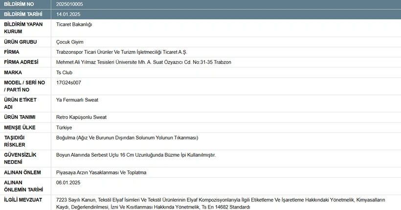 Son olarak, Trabzonspor’a ait TS Club markasının ürününe gelen yasaklama dikkat çekti. GÜBİS’te yayımlanan yeni duyuruda, bu kuruma ait çocuk ürünü olan ‘retro kapüşonlu sweat’in piyasaya arzının yasaklandığı ve söz konusu ürün için toplatma kararı verildi.