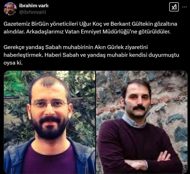 “Gazetemiz BirGün yöneticileri Uğur Koç ve Berkant Gültekin gözaltına alındılar. Arkadaşlarımız Vatan Emniyet Müdürlüğü’ne götürüldüler. Gerekçe yandaş Sabah muhabirinin Akın Gürlek ziyaretini haberleştirmek. Haberi Sabah ve yandaş muhabir kendisi duyurmuştu oysa ki.”