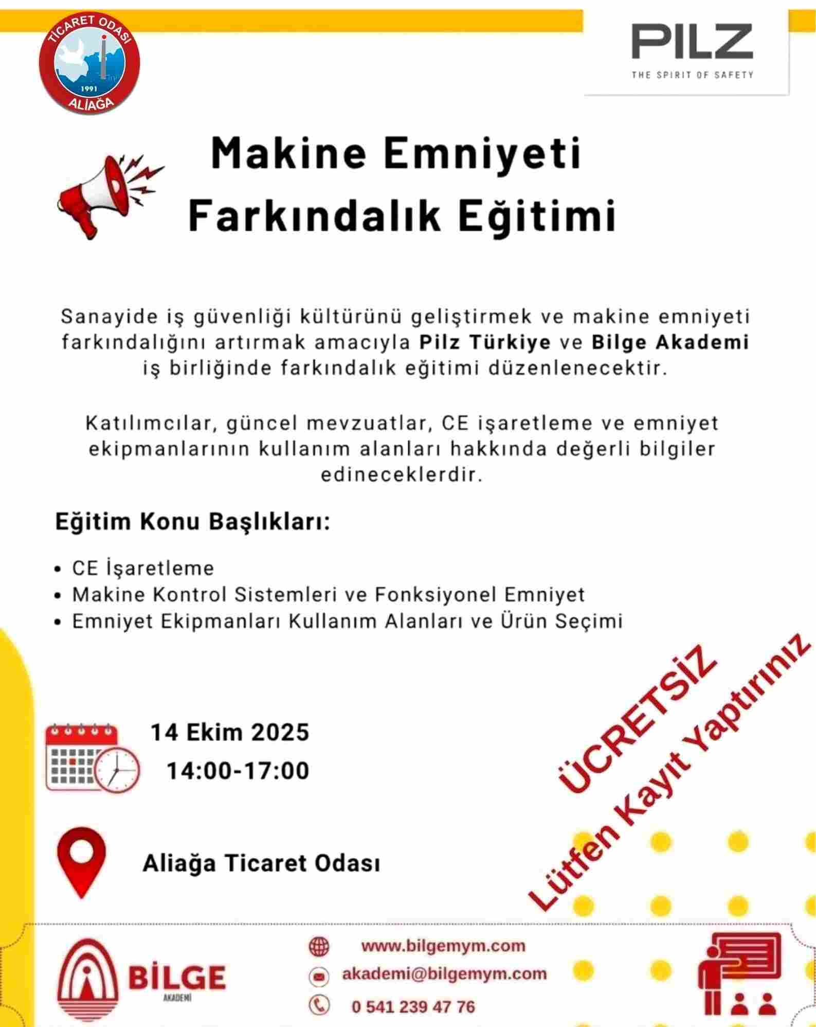 Sanayi tesislerinde iş güvenliği bilincini artırmak, makine emniyeti ve ekipmanlardan kaynaklı risklerin değerlendirilmesi ile risk azaltım yöntemleri konusunda katılımcıları bilgilendirmek amacıyla düzenlenecek eğitim, 14 Ekim 2025 Salı günü saat 14.00’te Aliağa Ticaret Odası’nda gerçekleştirilecek.