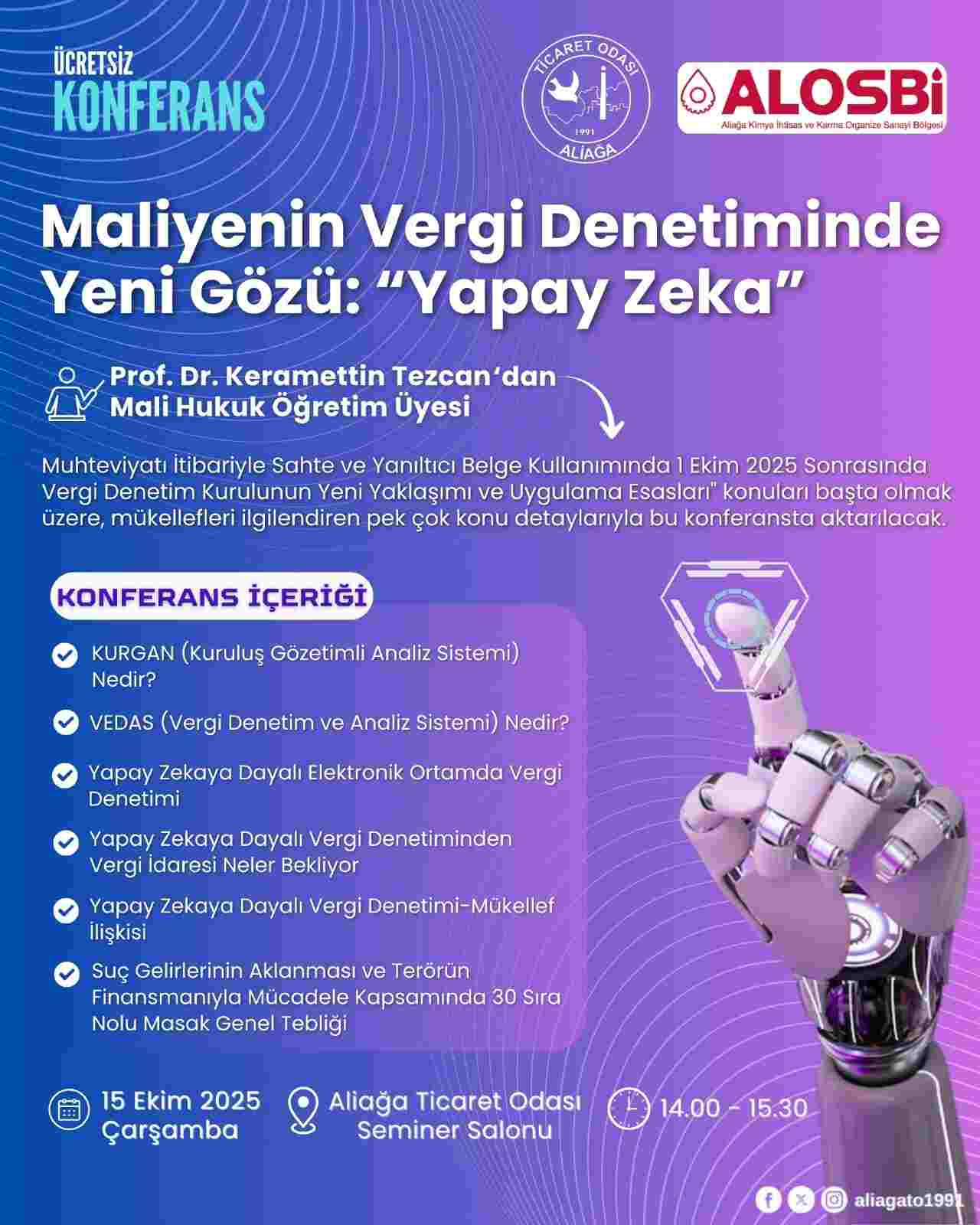 İş dünyasını ve vergi mükelleflerini yakından ilgilendiren “Maliyenin Vergi Denetiminde Yeni Gözü: Yapay Zeka” başlıklı konferans, 15 Ekim 2025 Çarşamba günü saat 14.00’te Aliağa Ticaret Odası’nda gerçekleştirilecek.