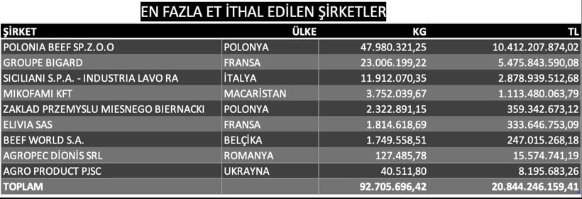 Karkas et ithalatının Polonya, Macaristan, Romanya, İtalya, Fransa, Belçika ve Ukrayna olmak üzere 7 ülkeden yapıldığını belirten Özgür, en fazla etin alındığı şirketi şu sözlerle söyledi: