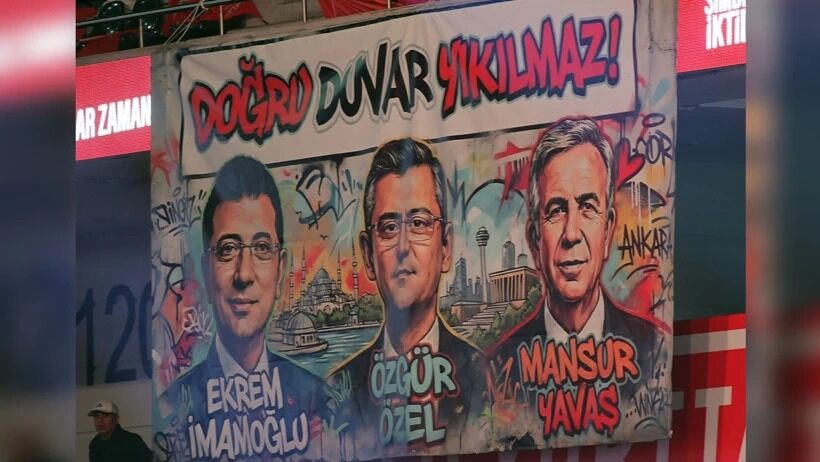 Salonda “Şimdi İktidar Zamanı” Kurultayı’nda, Özgür Özel, Ekrem İmamoğlu ve Mansur Yavaş’ın resimlerinin olduğu “Doğru duvar yıkılmaz” pankartı dikkat çekti.