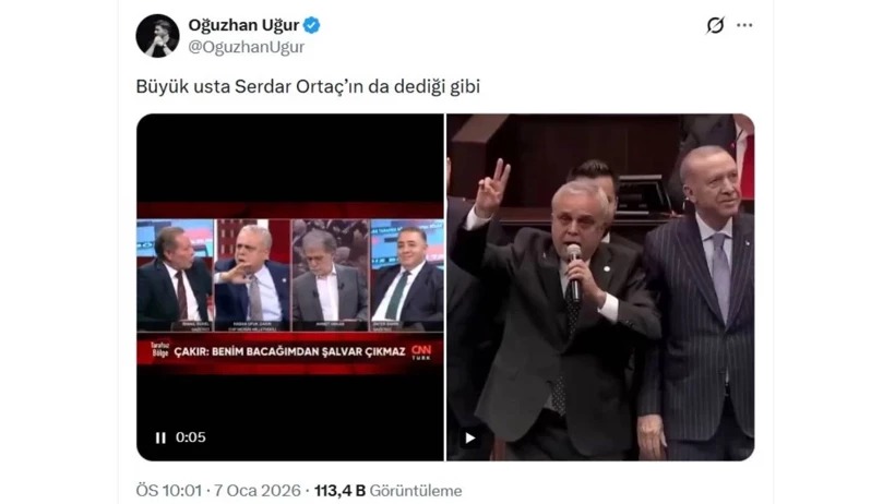 Çakır’ın AKP’ye katıldığı videosu ile AKP teklifine sinirlendiği videoları sosyal medya hesabından paylaşan Uğur, ”Tıpkı Serdar Ortaç’ın dediği gibi” diyerek şarkısına gönderme yaptı.