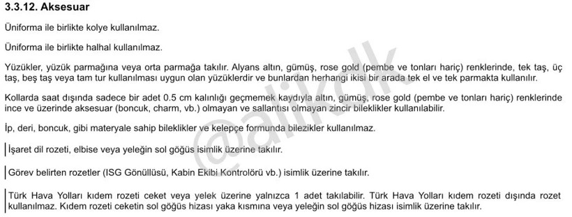 Yeni yönetmeliğin 3.3.12 numaralı “Aksesuar” bölümü, üniforma ile birlikte kullanılabilecek eşyaları detaylı olarak tanımlıyor. Buna göre, kabin ekipleri basit ve sade tasarımlı aksesuarlar takabilecek. Örneğin, yüzük, parmağına veya orta parmağa takılan ince bir adet 0,5 cm kalınlığındaki altın, gümüş, rose gold (pembe ve tonalı hariç) renkte bileklik veya zincir kullanılabilecek. Ip, deri, boncuk gibi materyallerden yapılmış bileklikler ve kelepçe formundaki bilezikler ise yasak.