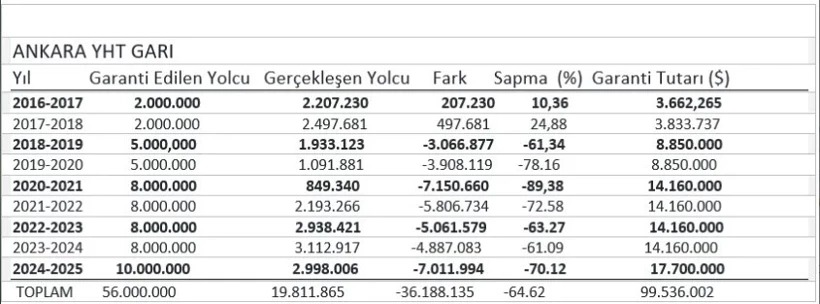 Tablodan izlenebileceği gibi, 2016-2025 dönemin arasında garanti edilen yolcu sayısı 56 milyon olmasına karşın 19 milyon 811 bin 865 yolcu Gar’dan çıkış yaptı. 10 yıl boyunca yalnızca ilk iki yıl garanti tutarının üzerine çıkıldığı görülüyor.