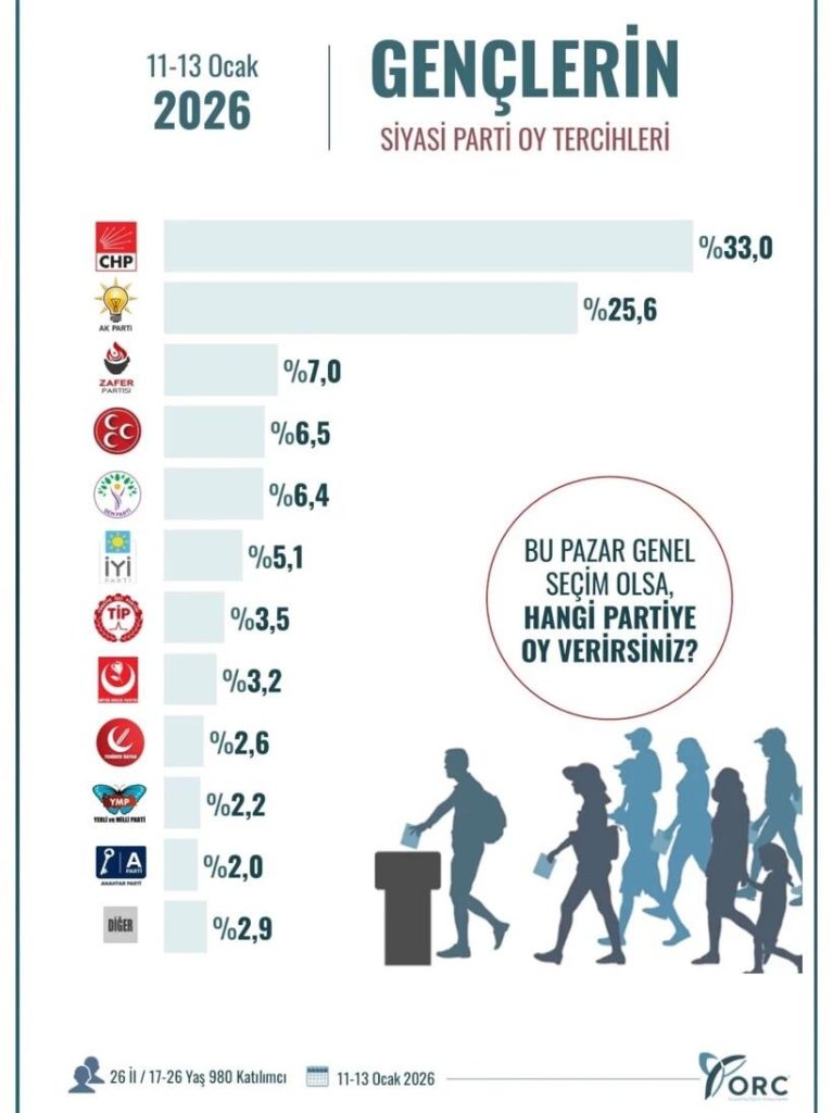 Anket şirketleri ise her ay olası bir seçim için, anketlerini tazeliyor. ORC Araştırma şirketi, 11-13 Ocak tarihleri arasında 26 ilde gençlere yönelik bir anket gerçekleştirdi.