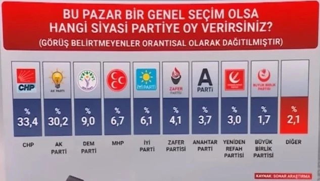 Görüş belirtmeyenler orantısal dağıtıldığında CHP olsu genel seçimde yüzde 33,4’lük oyla Türkiye’nin yeni iktidar partisi oldu. AKP oyların yüzde 30,2’sini alabildi. DEM Parti yüzde 9 oy oranıyla TBMM’ye girebilen 3’üncü parti oldu. Ankete göre MHP de dahil TBMM’ye başka bir parti giremiyor…