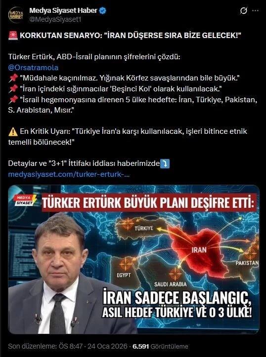 ABD-İsrail hegemonyasına uzun süredir direniyor olması nedeniyle İran’ın en zayıf halka olduğunu söyleyen Ertürk, “Bu nedenle ilk İran vurulacaktır. Daha sonra Pakistan, Türkiye, Suudi Arabistan ve Mısır hedef olacaktır” sözlerini sarf etti.